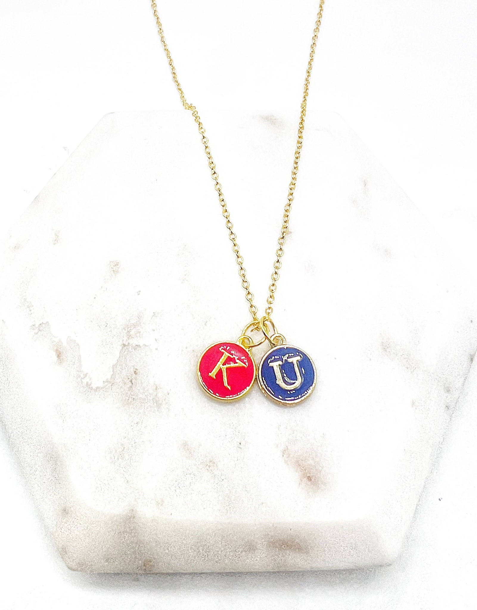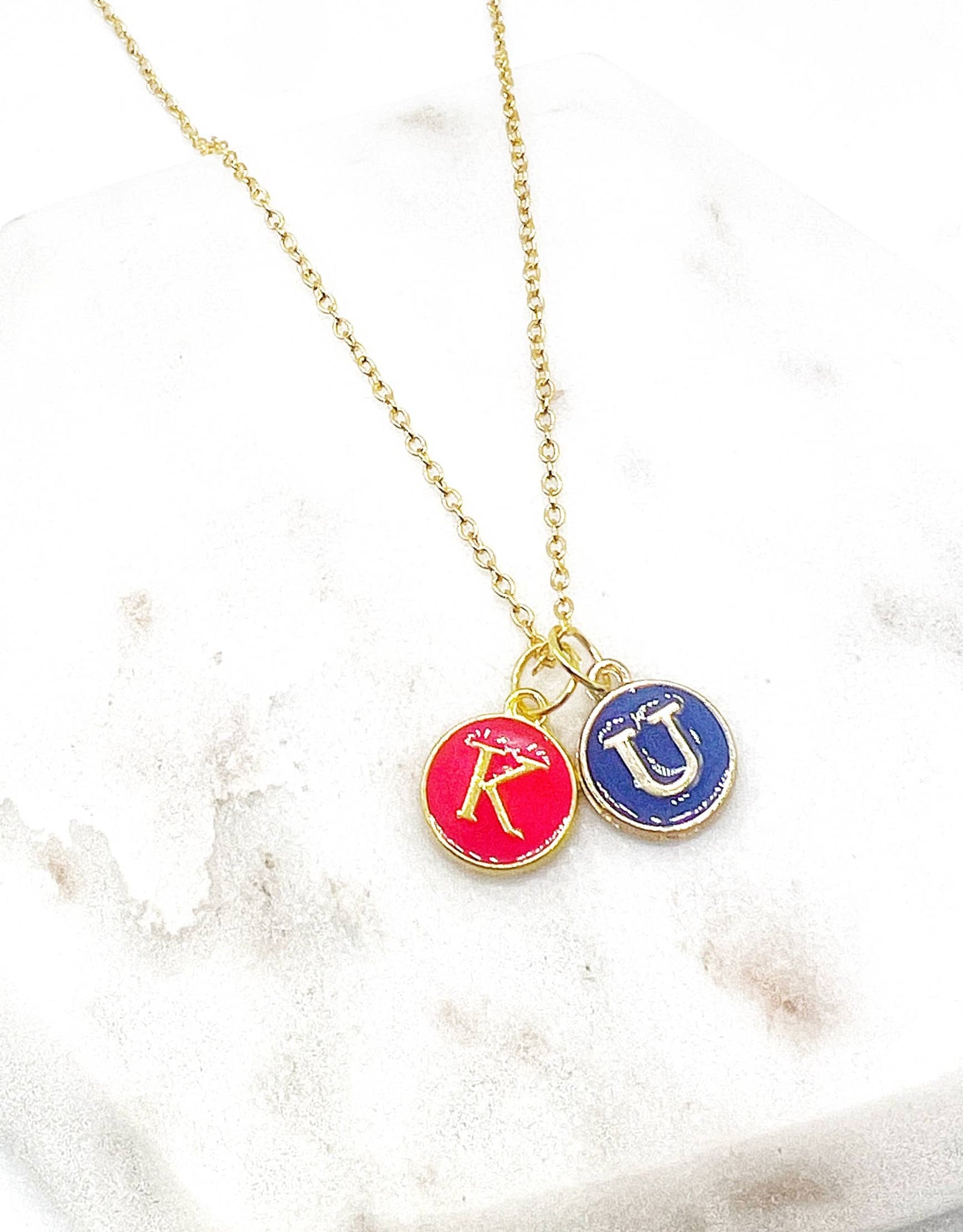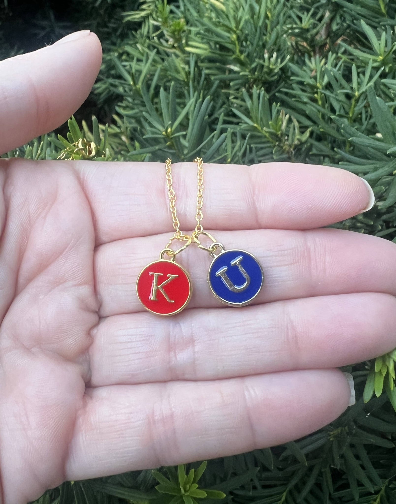 Show your Jayhawk pride with this KU initial necklace. K and U are on both sides of the charm Necklace chain measure 18 inches.